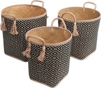 Crafted from handwoven palm leaf, this basket set offers natural style combined with functional design. Rope handles with knotted tassel accents add durability and a distinctive decorative touch. Perfect for storing throws, toys, or laundry, these baskets provide versatile storage with artisanal character.