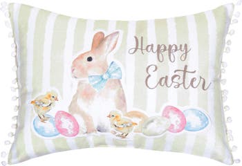 Celebrate the joy of Easter with this charming lumbar pillow featuring a delightful springtime scene. The watercolor artwork showcases an adorable tan bunny wearing a sweet light blue polka dot bow, seated among a gathering of fluffy yellow chicks and beautifully decorated Easter eggs in soft pink, sky blue, and sage green. The phrase "Happy Easter" appears in elegant brown script, completing this heartwarming seasonal composition. The design is set against a fresh green and white striped background that adds classic cottage charm to the watercolor imagery. Crafted from cotton blend fabric, this pillow features a removable cover for added convenience. Delicate white pom pom trim lines both sides, adding playful texture and a polished finishing touch that enhances the overall sweetness of the design. The soft pastel color palette works beautifully with farmhouse, traditional, and cottage decor styles. At 13 inches by 18 inches, this lumbar pillow is perfectly proportioned for sofas, armchairs, beds, and entryway benches.