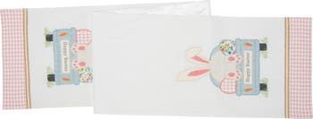 - This 100% polyester table runner features a white ground with an appliquéd Easter scene at each end, depicting a bunny riding a blue truck with a Happy Easter sign, pink gingham details, floral fabric accents, carrots, and green grass.