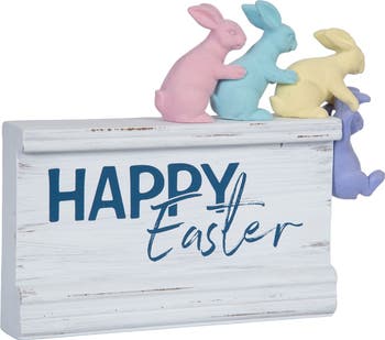 - This cheerful decorative piece features four adorable pastel bunny figurines in pink, aqua, yellow, and lavender playfully climbing across the top of a distressed white MDF block sign displaying "Happy Easter" in navy blue mixed typography lettering.