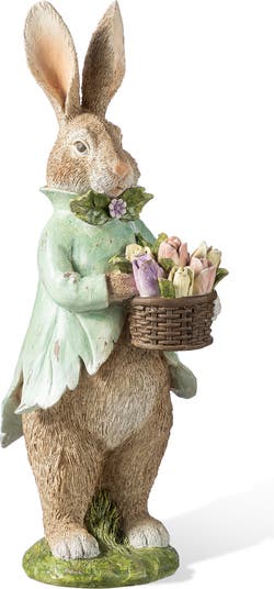 This 15.5"H Easter Resin Bunny Girl or Boy Table Decor features a charming bunny figurine dressed in a pink petal-like outfit and a green bow. It holds a bouquet of purple and white flowers, making it a sweet and festive addition to Easter tabletops.