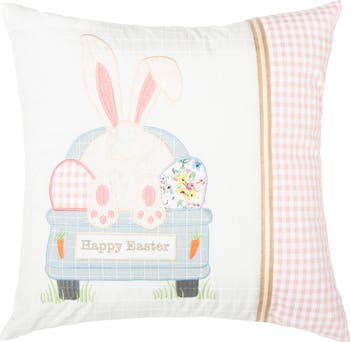 - This delightful Easter pillow features an adorable bunny viewed from behind riding in a blue plaid pickup truck with decorated eggs in pink gingham and floral patterns, sweet pink paw pads visible, and a "Happy Easter" license plate with orange carrot accents on textured white.