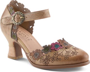 Aged-finish hardware and hand-painted floral accents bring artisanal charm to a burnished leather pump set on a mixed-media block heel and secured by an adjustable ankle strap.