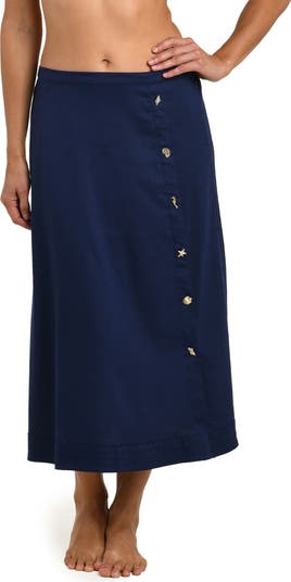 Golden, ocean-inspired buttons highlight the front of this cover-up skirt that's perfectly on theme for a day at the beach or resort.