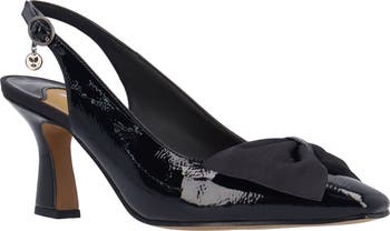 Memory foam cushioning puts hidden comfort underfoot this patent slingback pump topped with a big grosgrain bow.