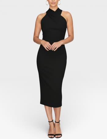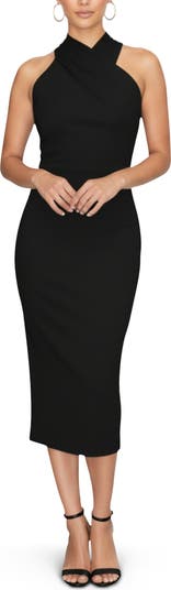 Hugging your curves with a sleek sheath silhouette, RACHEL Rachel Roy offers a sophisticated look with this solid-colored dress. Hitting below the knee for an elegant length, it's finished with a chic crossover halter neckline for a modern finish.