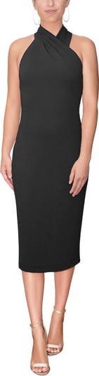 Hugging your curves with a sleek sheath silhouette, RACHEL Rachel Roy offers a sophisticated look with this solid-colored dress. Hitting below the knee for an elegant length, it's finished with a chic crossover halter neckline for a modern finish.