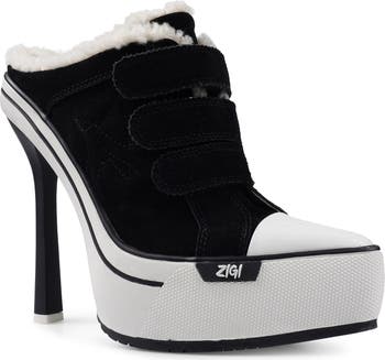 High-pile fleece trim provides a luxurious contrast to the sporty vibes of this sneaker-inspired pointy-toe pump.