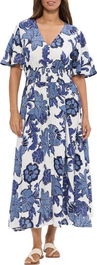 Summery dress days call for a blossom-tossed option cut from a linen-enriched fabric and offered in a flowy, easygoing silhouette.
