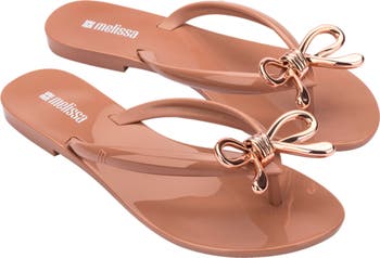 A whimsical metallic bow tops this water-resistant flip-flop crafted from the brand's signature fruit-scented PVC.