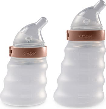 This set of digestion-friendly baby bottles made with German silicone has an ergonomic grip that mimics natural breastfeeding and a leak-proof, easy-latch nipple for comfortable, slow-paced feeding. They feature a tapered shape designed for upright feeding which helps reduce colic, gas and digestive discomfort and an advanced dual-venting system to prevent air ingestion.