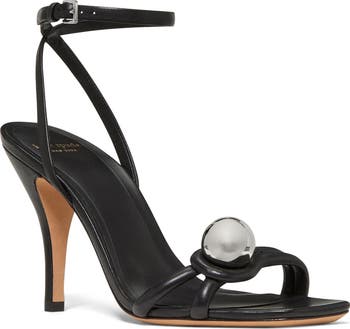 Polished hardware illuminates the slim leather straps of this lofty stiletto sandal.