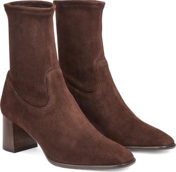 A stretchy shaft adds modern intrigue and easy wear to a creamy suede bootie balanced by a square toe and stacked block heel.