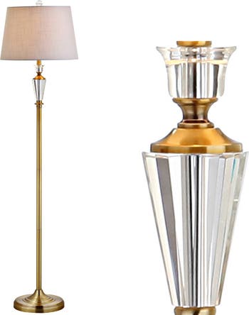 Supported by a round pedestal base, this gleaming brass floor lamp shows off a slender body that's punctuated with a classic faceted crystal detail. A crisp cotton drum shade and silk-wrapped cord complete the piece. Great for extra reading light next to a sofa or chair, or to bring light to a dim corner.