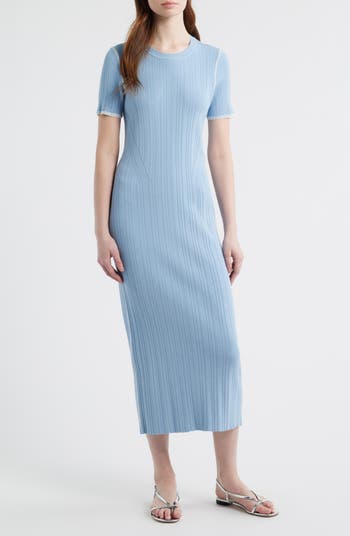 Whimsical whipstitching adds a playfully pretty note to a midi-length dress shaped with directional ribbing.