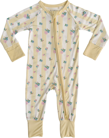 Harper brings vintage floral charm to our signature cloud-soft fabric. Scattered bouquets of blush pink, cornflower blue, and wildflower greens dance across buttery yellow and white stripes—like a sunlit spring morning wrapped in a jammy. Perfect for flower-loving littles and mamas who swoon for that heirloom look with a playful twist.