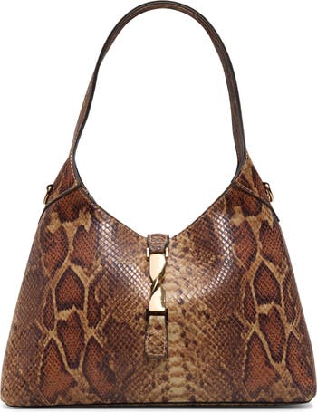 Gleaming logo hardware and clean lines highlight the snake-embossed faux leather on a fierce shoulder bag featuring a roomy interior and optional crossbody strap for on-the-go convenience.