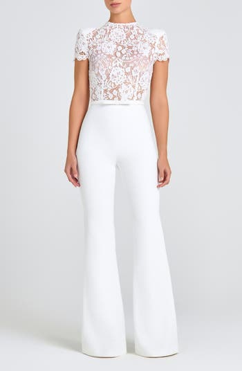 A slender belt centers this glamorous lace and crepe jumpsuit designed with lightly padded shoulders and perfect for achieving a two-piece look with one-and-done ease.