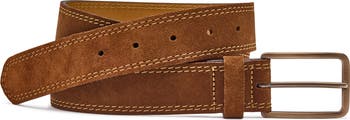 Rows of contrast stitching highlight the supple suede exterior of a versatile belt secured with a brushed buckle.