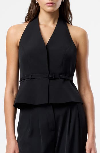 Smart meets sassy in a halter top offered with suiting style and cinched with a slim belt.