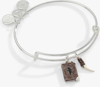 Tom Riddle’s diary isn’t just any diary — it’s one of Voldemort’s horcruxes. This HARRY POTTER™ charm bracelet features a charm of Tom Riddle’s diary, and also a charm of the basilisk fang Harry uses to destroy the diary, on an expandable wire bangle in antique silver finish. The diary is a three-dimensional charm with etched detailing and brown enamel; the fang is a three-dimensional charm made of translucent ombre enamel.