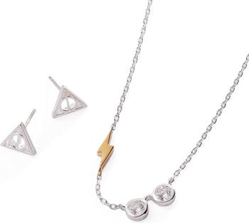 Bring a little bit of the Wizarding World to every day with this Harry Potter™ Glasses and Deathly Hallows Necklace and Earring Set. The 16” - 18” adjustable chain necklace features two inline two-tone charms: a lightning bolt and Harry’s glasses, accented with cubic zirconia crystals for the lenses. The matching earrings feature the mark of the deathly hallows. Gift the set to your favorite muggle or wear it for a touch of magical inspiration. inspiration.