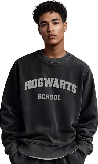 The Hogwarts School Sweater features a bold collegiate-style front graphic in a washed grey print, designed to evoke the spirit of classic university sweatshirts, but with BLVCK's signature moody minimalism. The garment-dyed vintage black finish gives it a worn-in feel, while the subtle Harry Potter x Blvck rubber patch on the upper back adds a refined final touch.