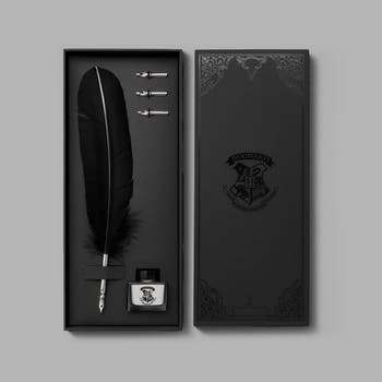 - Feather Pen Set: A matte-black feather quill with 3 interchangeable nibs and a pot of white ink, presented in a collectible Hogwarts × BLVCK embossed box. Designed for journaling, calligraphy practice, or a striking desk display.