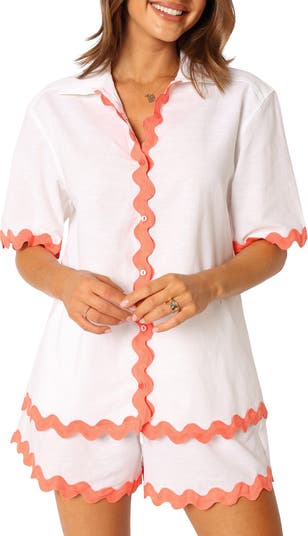 Outsized squiggles of adorable rickrack animate an oversized button-up shirt made from a lightweight blend of cotton and linen.