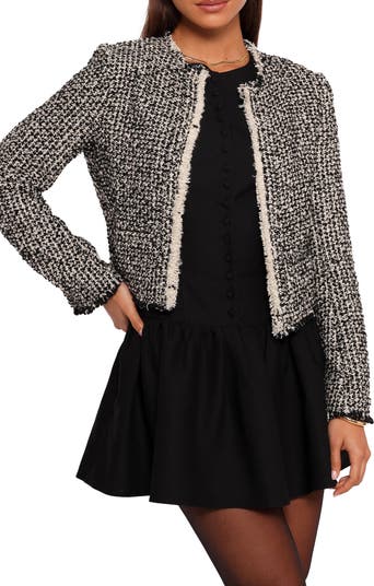 Crafted from textural black-and-white tweed, this fringe-trimmed jacket with a boxy fit adds a layer of edgy polish to any ensemble.