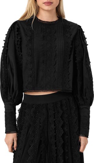 Ornate lace embroidery details this cropped blouse designed with voluminous bishop sleeves and a delicately finished neckline.
