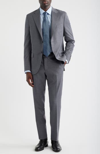 Charcoal-grey Italian wool patterned in a check of chalky whites and pale blues distinguishes a suit tailored with softer construction in the shoulders balancing the lightly contoured profile of the jacket. The flat-front pants sit comfortably at the waist and complement the traditional detailing to keep the silhouette crisp and clean.