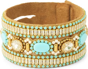 A wide, cuff-style silhouette encrusted with bright stones, faux pearls and baguette-cut crystals makes a statement when you accessorize with this vintage-inspired bracelet.