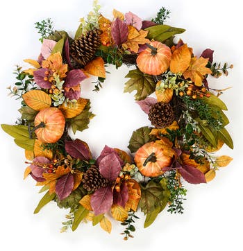 A festival mix of fall foliage, from pine cones to pumpkins and bay leaves to oak leaves, creates a bountiful harvest of autumn decor. The synthetic floral is UV protected, making it perfect for pumpkin-spicing-up your front porch.