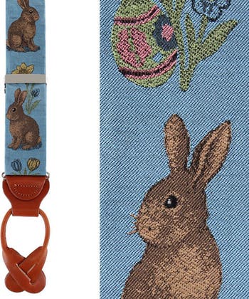 - Luxurious silk braces featuring an Easter-inspired motif of rabbits, eggs, and spring florals