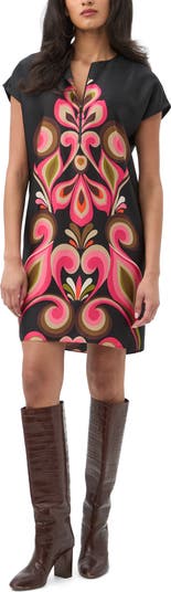 Wedge shaped pull on dress with a half zipper placket and cap sleeves in a placed print