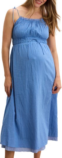 A strappy, midi, smocked, midi dress with a drawstring-tie that cinches to perfectly flatter the bump. Dimensional two tone plaid and raw edge detailing around the neck add a little flirt & flair.