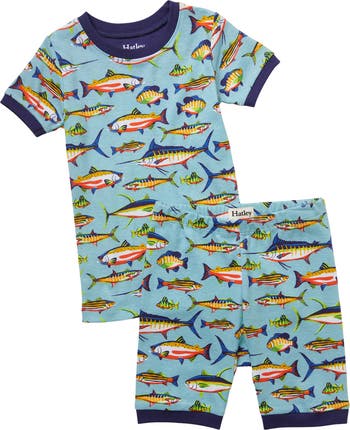 A school of fish swims across these soft cotton pajamas that will promote dreams of the ocean.