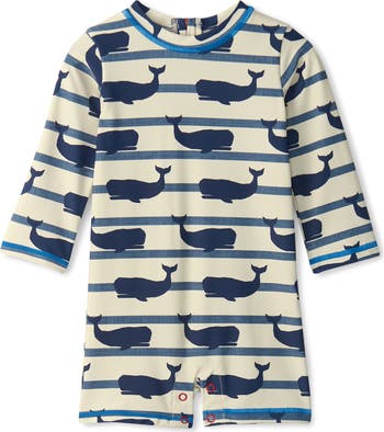 Your little one will have a whale of a time in this one-piece rashguard swimsuit featuring nautical stripes and built-in UV protection.