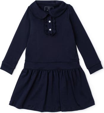 Pima cotton girls' long sleeve peter pan collar dress with ruffled button plackets and drop waist. Made from 100% Peruvian Cotton.