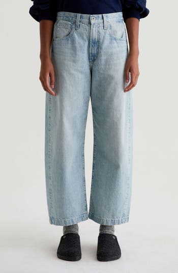 Whiskering and fading add to the retro feel of these barrel-leg jeans cut from nonstretch denim.