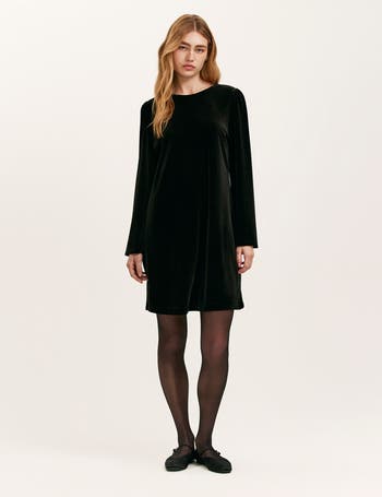 The Hattie Dress is a sophisticated shift dress crafted from luxurious, plush velvet. It features a classic mini-length cut, a simple round neck, and long, flared sleeves with subtle gathering at the shoulder. A timeless silhouette perfect for festive events and winter evenings.