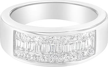 A diamond band that features three rows of diamonds set within a wide flat band. The alternating princess and baguette cut diamonds add a modern touch to this unique design. It has a total diamond weight of 1 carat.