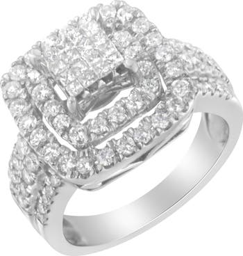 This diamond cocktail ring sparkles with a central square cluster of round diamonds surrounded by a double halo. The wide band is crafted in 14 karat white gold and has three rows of round diamonds. It has a total diamonds weight of 1 1/2 carats.