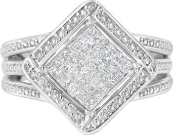 Elegant and timeless, this gorgeous 92.5% sterling silver cocktail ring features 0.4 carat total weight of diamonds with a whopping 36 individual stones. The fashion ring features a square-on-point composite diamond made up of 36 invisible set square, princess cut diamonds that give the illusion of one massive gem. This cluster sits inside a rounded milgrain edged border supported by a tri split shank also detailed with silver beading. The ring has a tapered band and a decorative openwork cutout gallery. This classic, feminine cocktail ring makes a great gift for any special occasion! Whether worn for daytime glamour or evening sparkle, this cocktail ring is gorgeously versatile. Give her a gift that will perfectly complement her favorite ensemble.