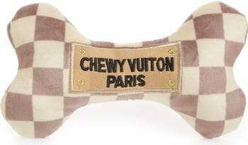 A plush, squeaky dog bone gets a faux-couture upgrade with iconic checks and a 'CHEWY VUITON PARIS' patch—perfect for pampering your own upscale pup.