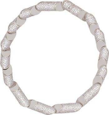 The Haute Séquence jewelry line is a tribute to Marie-Blanche de Polignac, Jeanne Lanvin's daughter, and also a musician. The sophisticated, minimalist shapes of these jewels are inspired by the geometric symbols used in musical scores. This necklace is traditionally handcrafted. It is composed of several beveled cylinders, which are linked by a fine metal chain thus creating an elegant movement. The cylinders are paved with 5,500 cubic zirconia, a synthetic stone that imitates the brilliance and appearance of diamonds.|