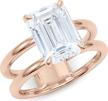 This 18-karat-gold ring brings powerful shine with a lab-created diamond featuring a dimensional emerald cut and modern double band.