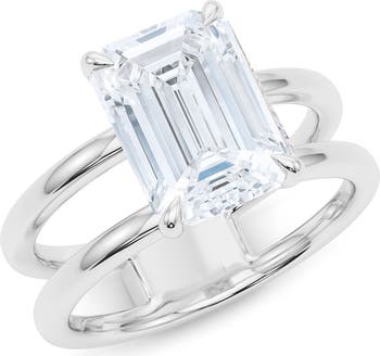 This 18-karat-gold ring brings powerful shine with a lab-grown diamond in an elegant emerald-cut prong setting atop a modern double band.