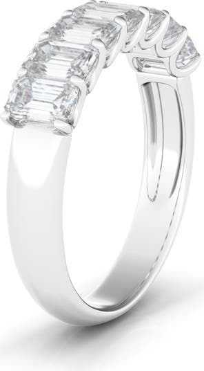An arc of seven emerald-cut lab-created diamonds brilliantly complements the gleaming 18-karat-gold band of this simple yet stunning eternity ring.